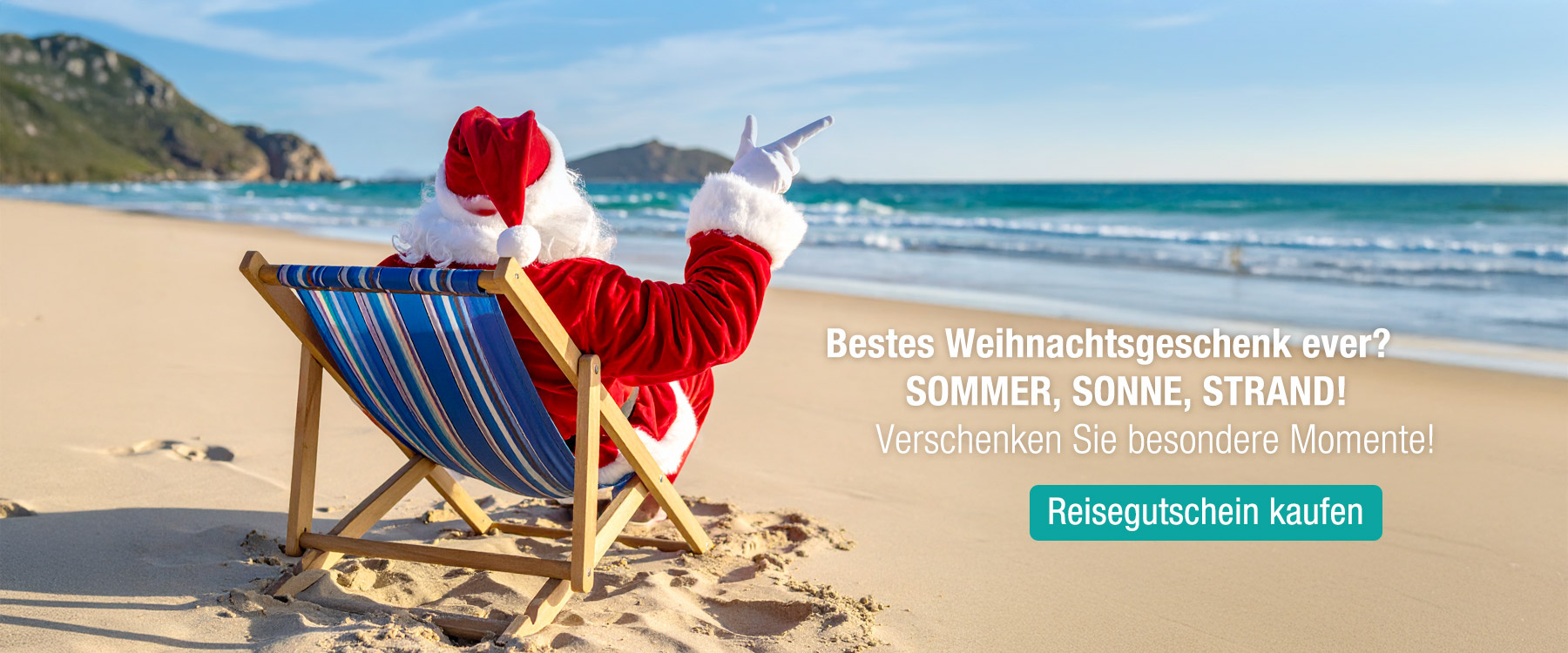Zwei Personen umarmen sich am Strand bei Sonnenuntergang. Text: "Für eine kleine Freude zwischendurch... Jetzt Gutschein kaufen."